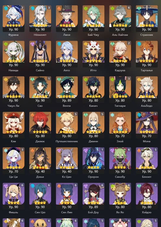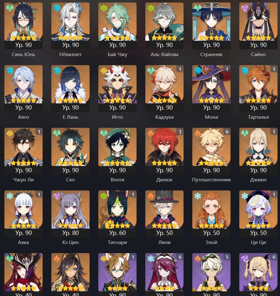 📈 Ранг: 55 🧍♀️ Персонажи: Бай чжу, Тигнари, Сайно и другие 🦾 Оружие: 5 звезд ✨ Примогемы: 85