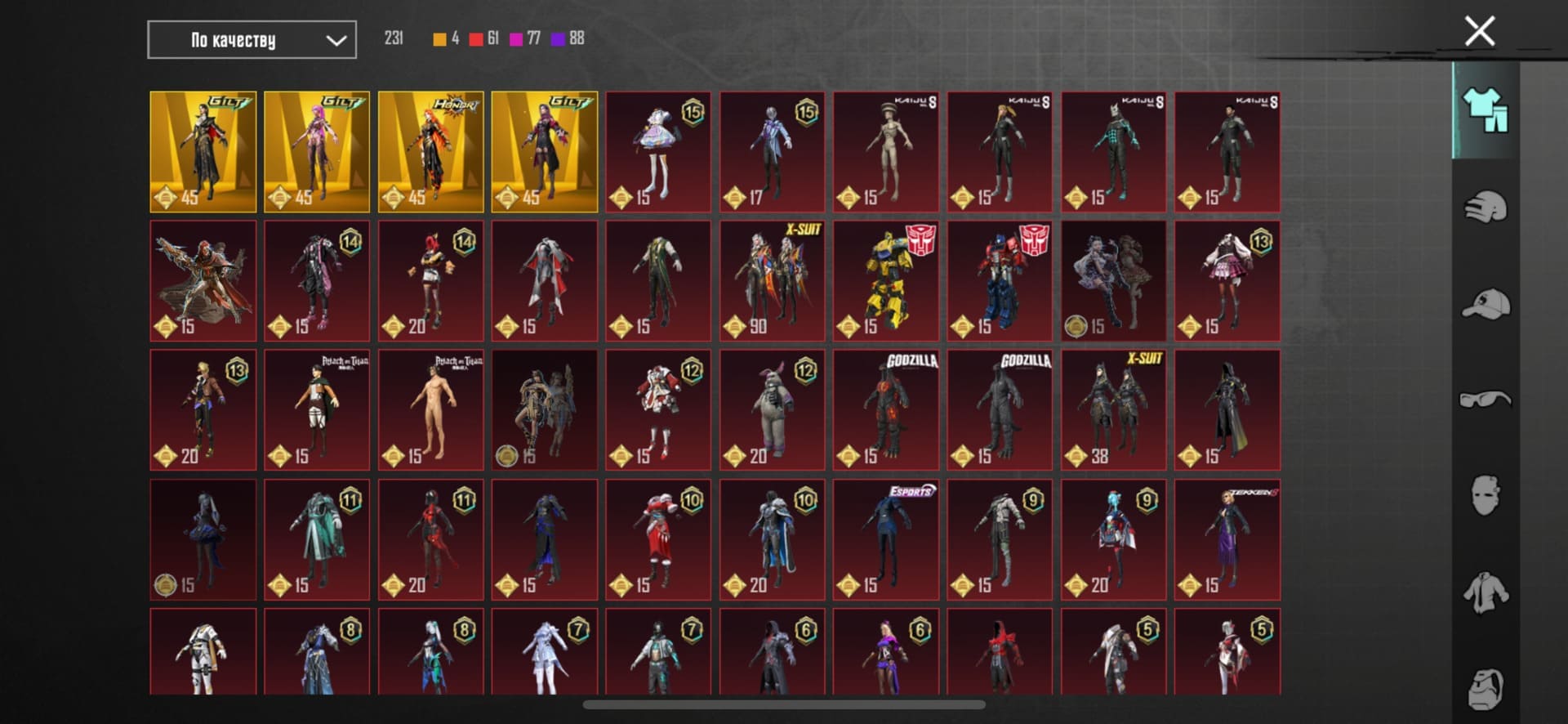 👚Топ костюмы: 65; ⭐️Royale Pass: с 5 сезонна; 🌈Скины на оружие: 36;